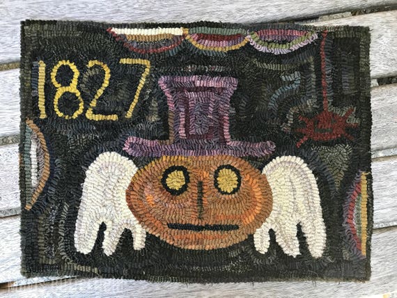 Primitive Folk Art Hooked Rug Tombstone Pumpkin Angel Early Style